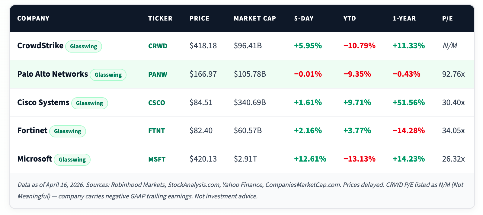 Five of the eleven Glasswing partners are publicly traded. Here's where they stand as of April 16, 2026 — and how the market has responded in the week following the announcement.