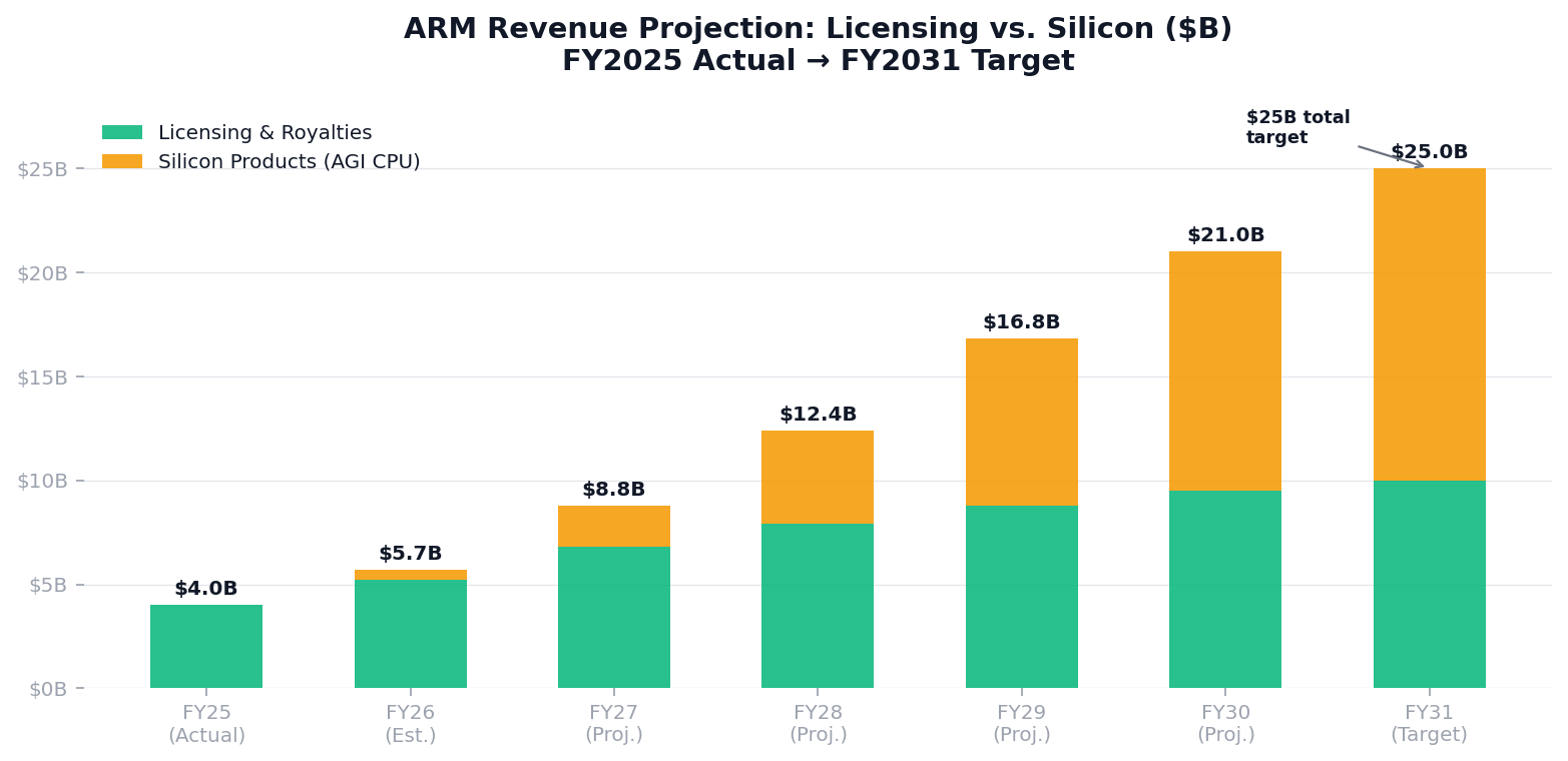 But here's the thing: now they're selling a finished product. That's a completely different revenue opportunity. CEO Rene Haas said on stage that the AGI CPU is expected to generate $15 billion in revenue annually by 2031. Total projected revenue by 2031? $25 billion, with earnings per share of $9. That's more than six times what they made in 2025.