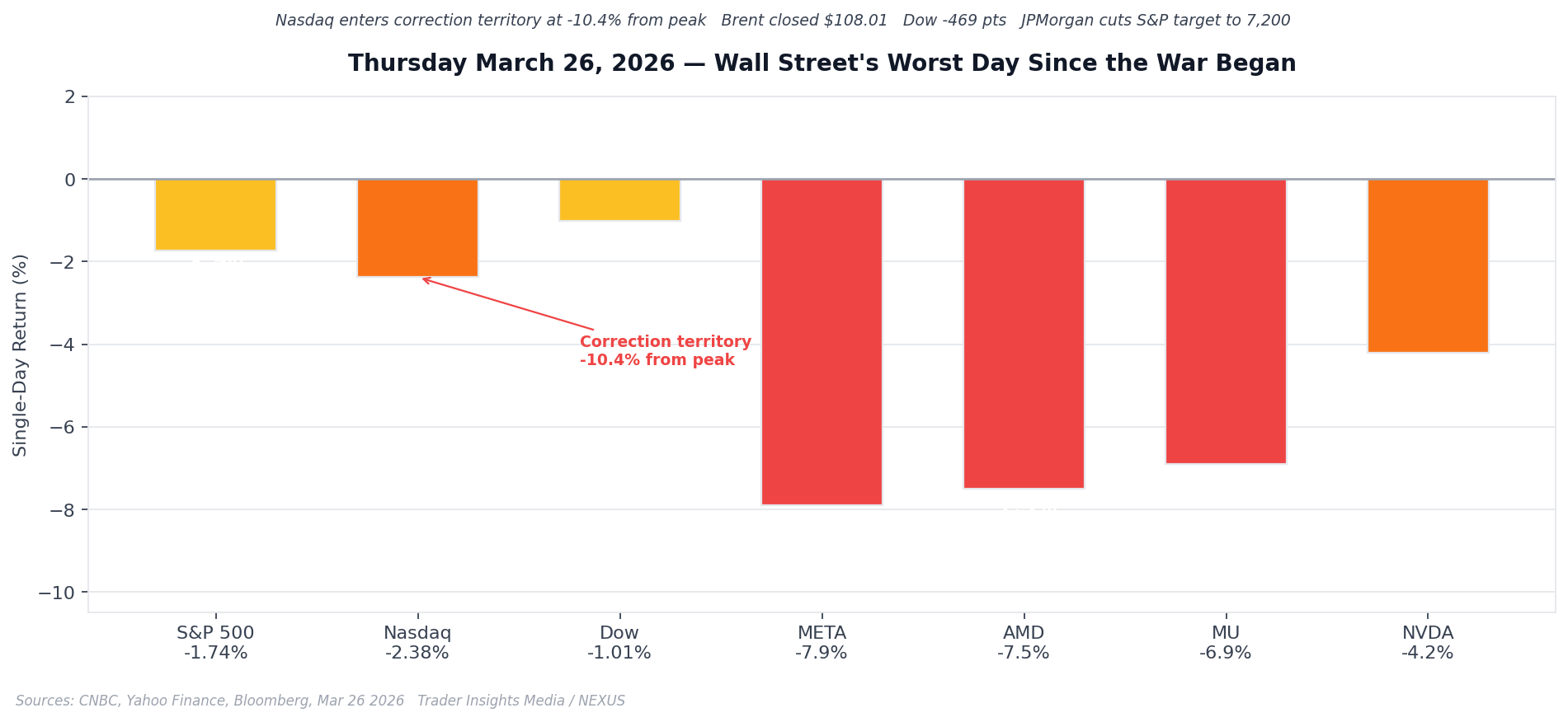 Thursday was not a bad day. It was a repricing event. The Nasdaq is in correction, the Fed is trapped, and JPMorgan cut its full-year S&P target. Friday's open inherits all of that context plus a Brent reversal to $107–110. This is not the bottom until there is Hormuz clarity.