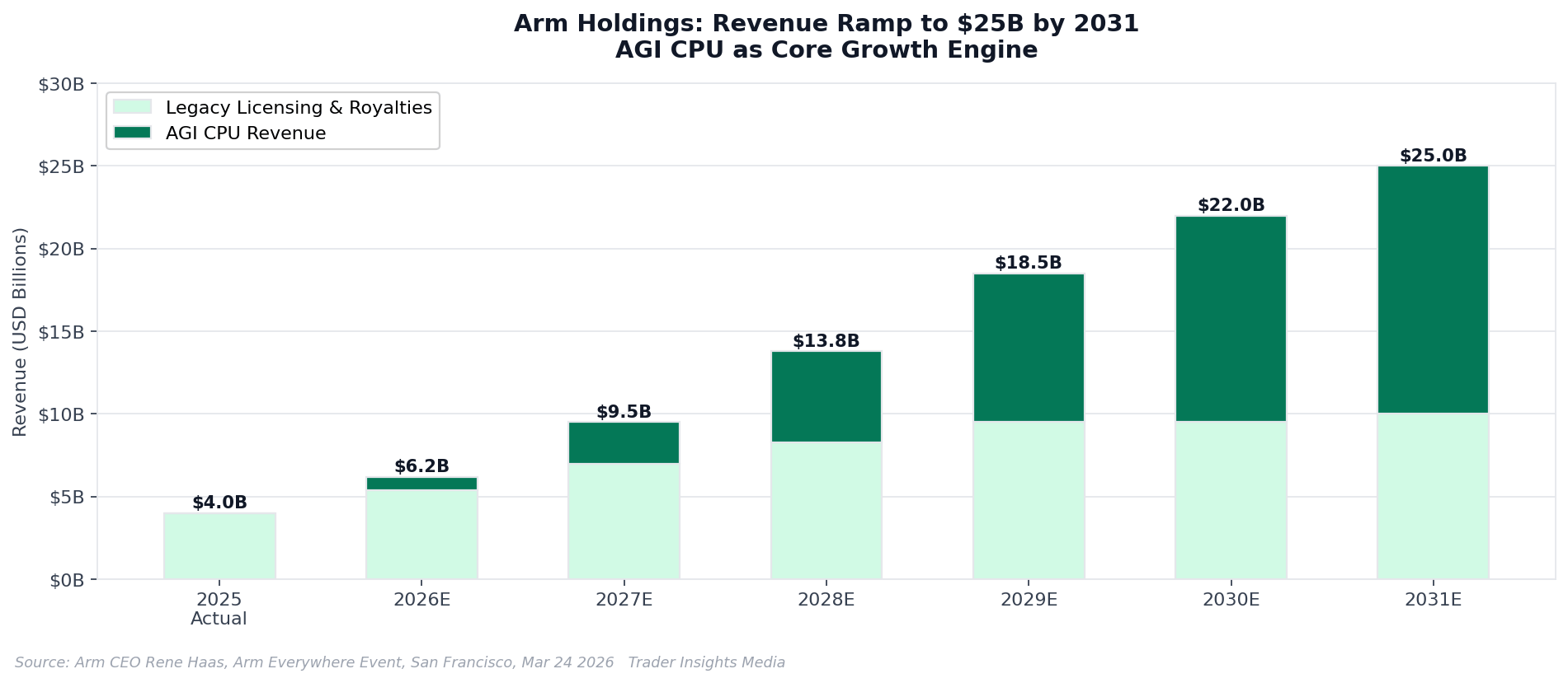 First AGI CPU shipment milestone — the $15B 2031 projection needs revenue to start appearing in Arm's FY2027 results to be credible