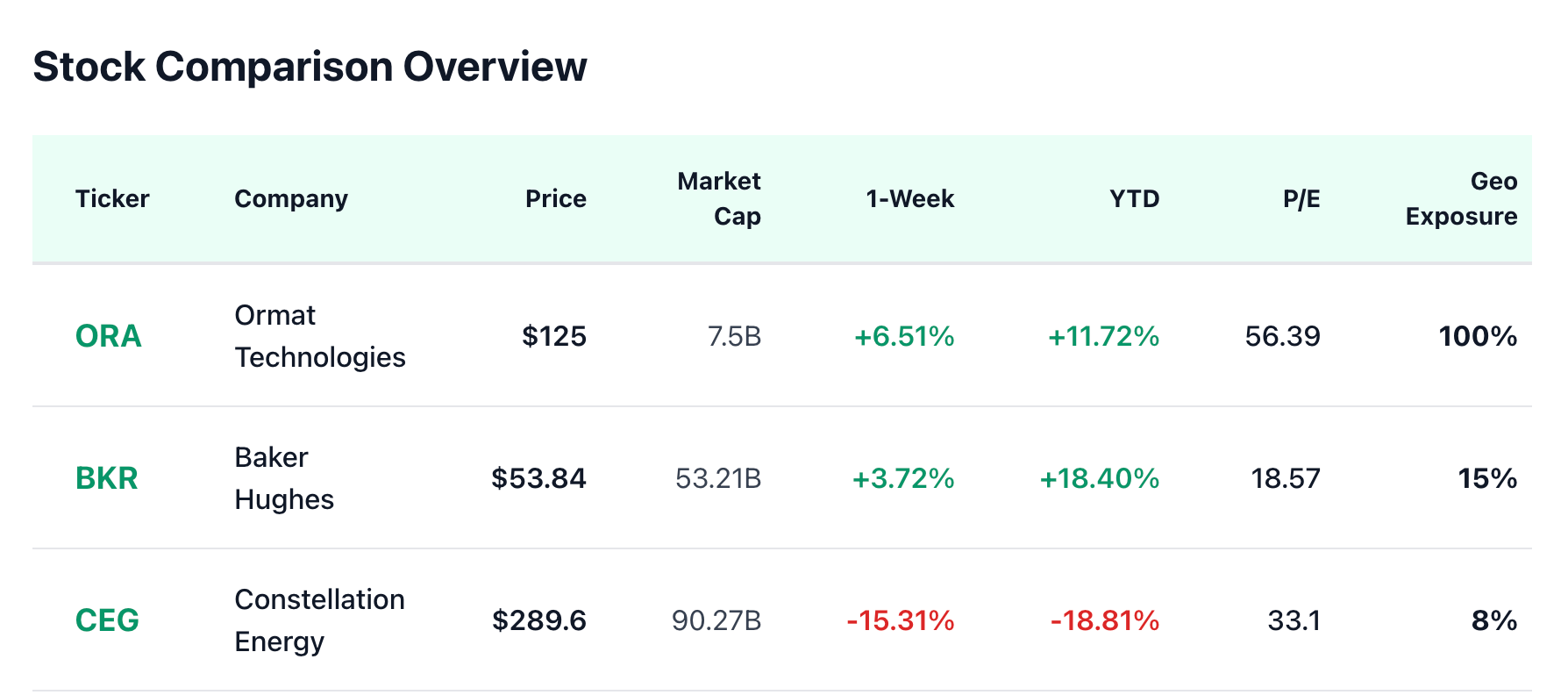 Constellation (CEG) became the value play nobody expected. The -18.81% drop this year created a gap between price and potential. Analyst targets averaging $370 imply 27.8% upside, the largest opportunity of the three. The 33.10 P/E sits between ORA's premium and BKR's value, suggesting the market is uncertain about direction.