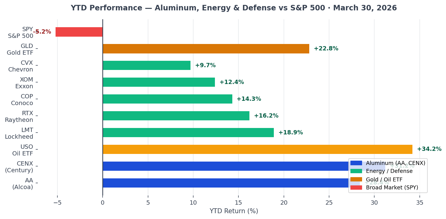 Alcoa (AA): up +28.4% YTD. Primary aluminum producer with US and international smelters fully insulated from the Gulf supply shock