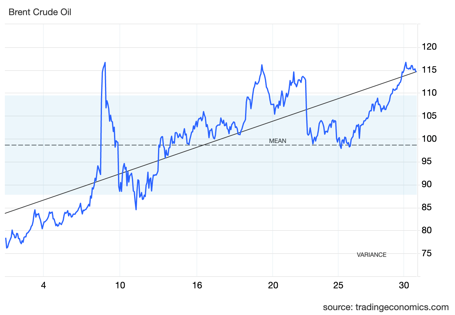 WTI at $101.50, Brent at $115, and a Dow in confirmed correction are the baseline.