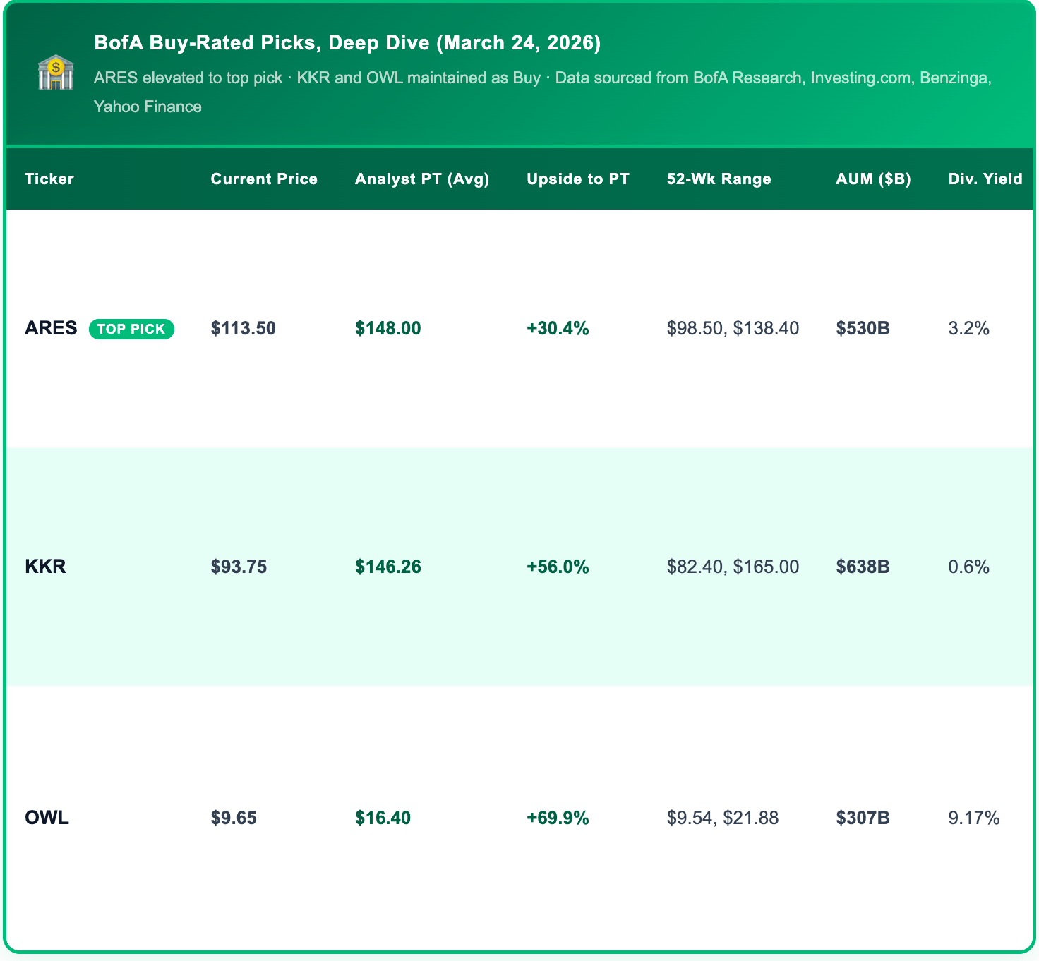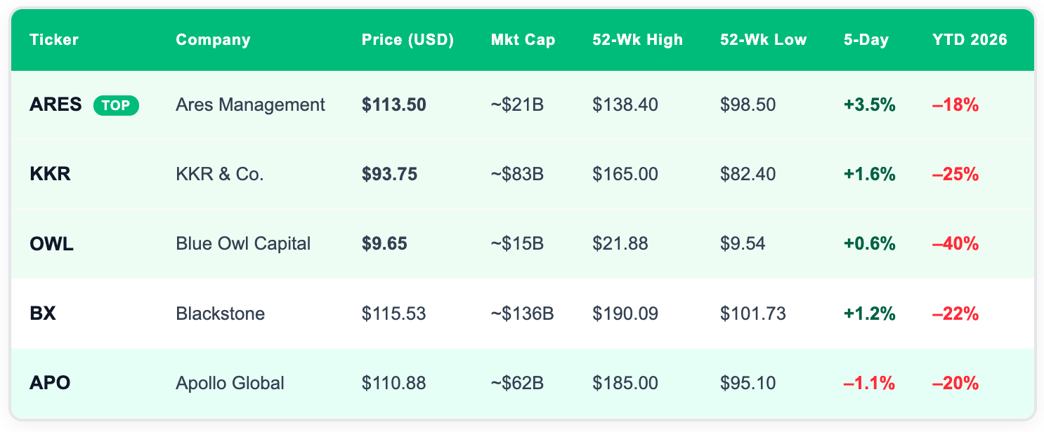 ARES at 30% below its analyst price target. KKR trading at a 56% discount to consensus. Blue Owl yielding 9.17% while trading near its 52-week floor.
