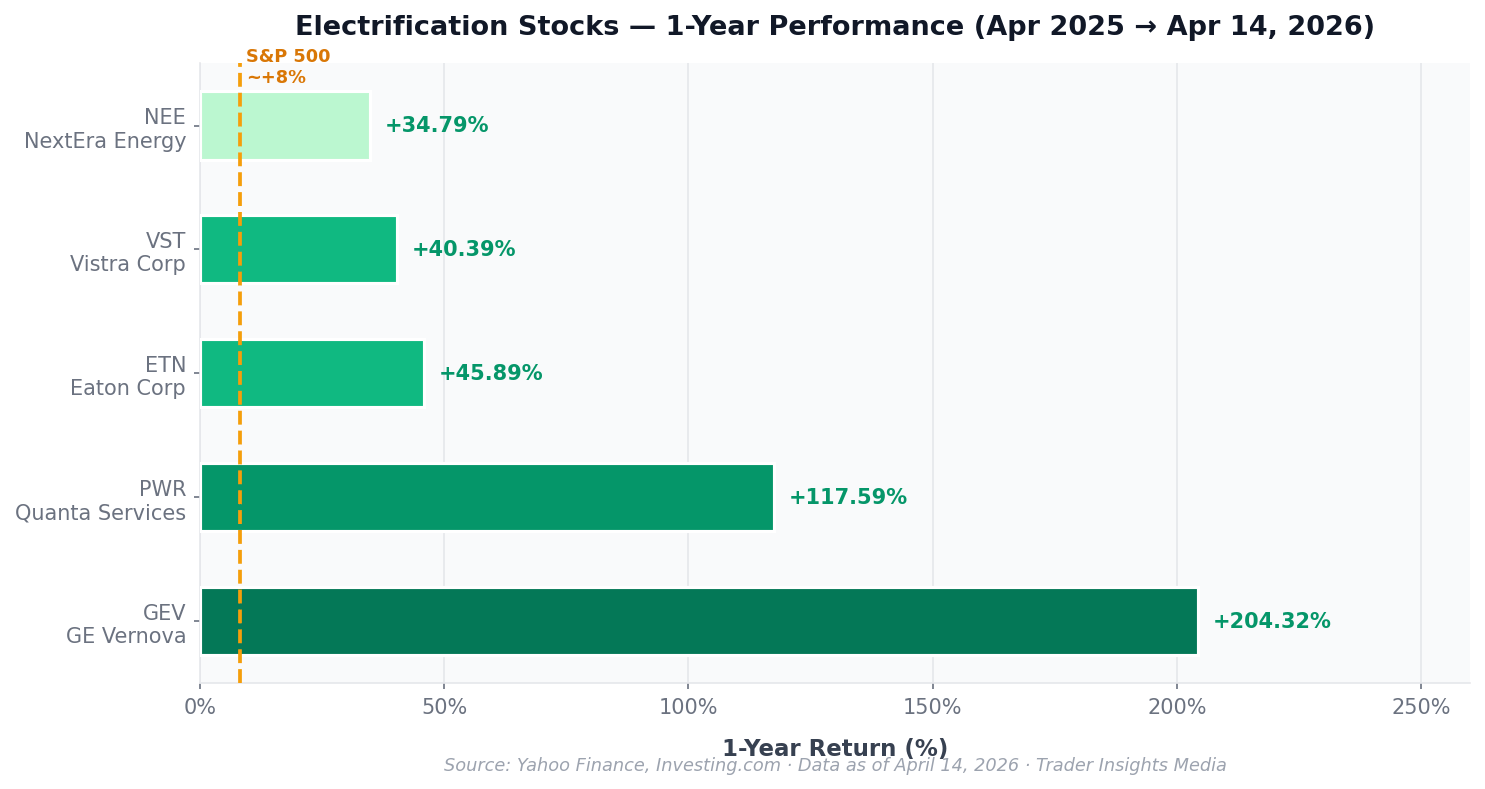 +204.32%— GEV's 1-year return through April 14, 2026 — making it one of the best-performing large-cap stocks in the market over that stretch.