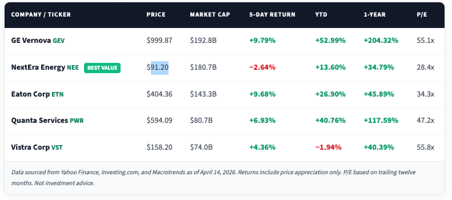 Five stocks — GEV, NEE, ETN, PWR, VST — are the clearest ways to play this trend. Three of them are trading at fair-entry prices today.