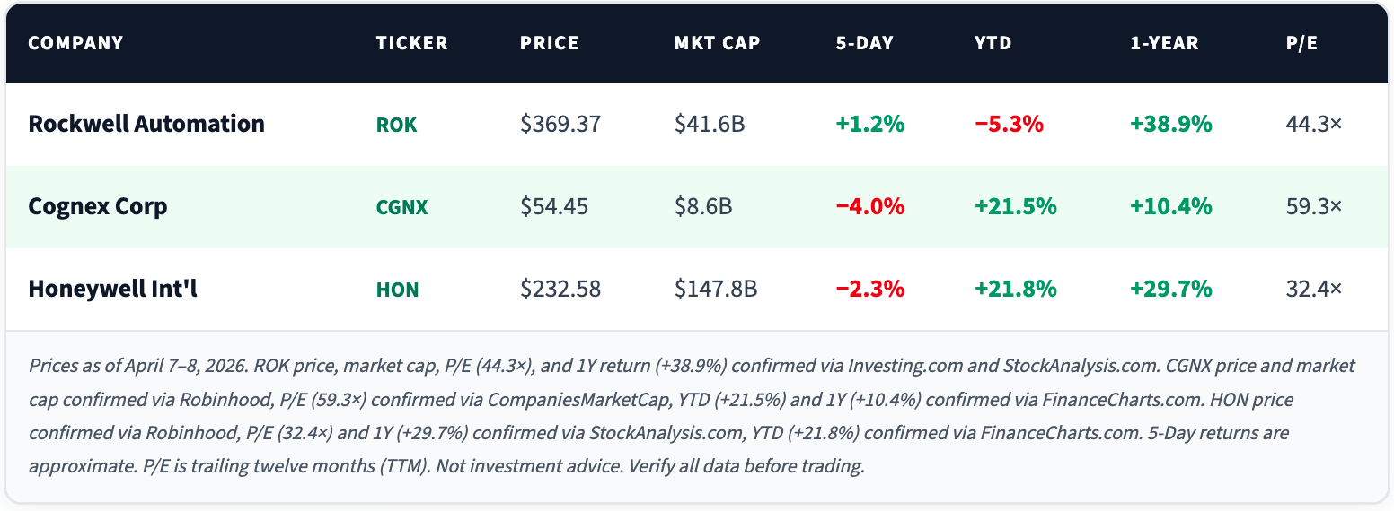 These are the companies most directly exposed to the lights-out manufacturing wave, from industrial automation platforms to machine vision and smart factory software.