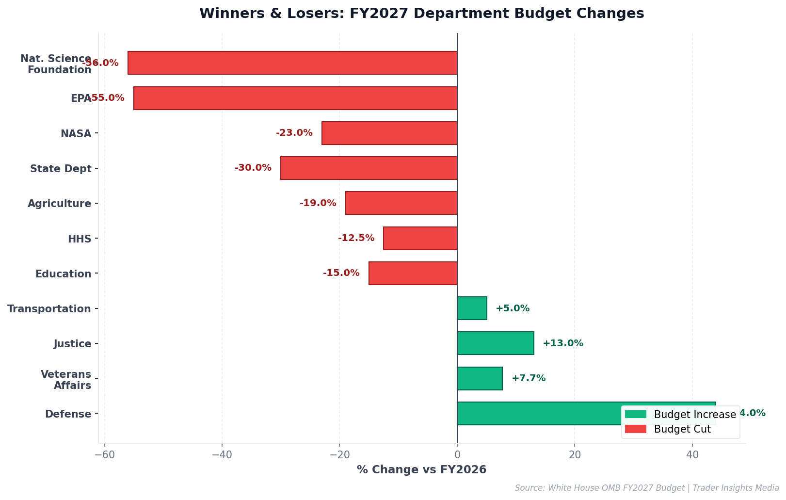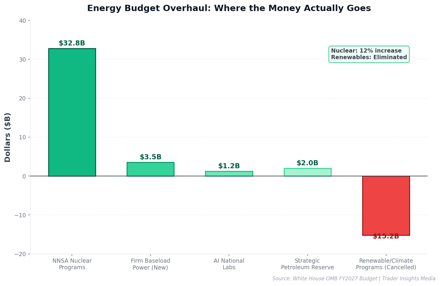 That doesn't mean the budget is meaningless for investors. Even partial passage of the defense spending increases would represent a multi-year revenue tailwind for the sector. And the energy shift is already happening: $15.2 billion in Infrastructure Act funding for renewable energy projects is being cancelled. In its place, $32.8 billion goes to the National Nuclear Security Administration, a 12% increase, to develop new warheads and next-generation naval reactor technology.