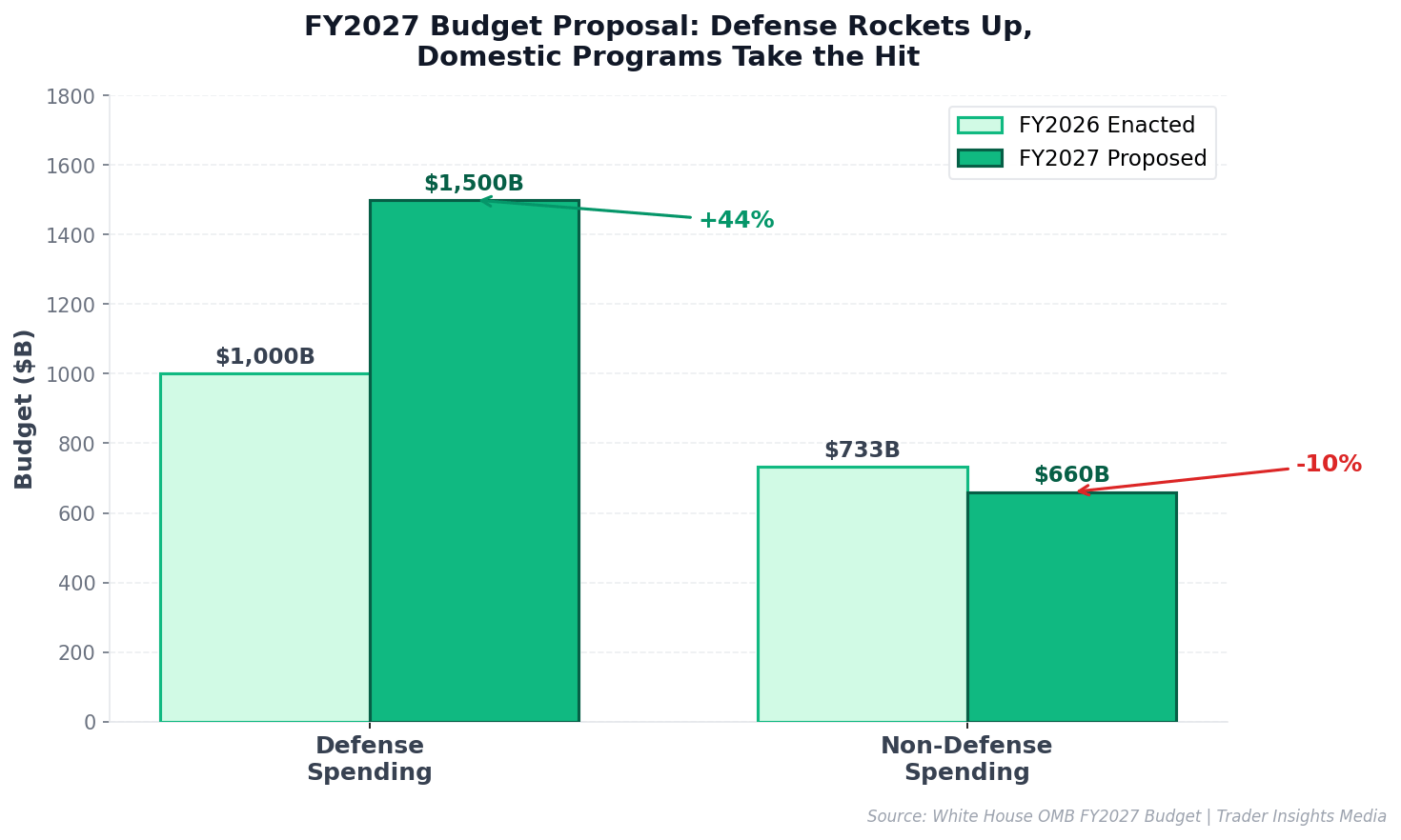 Budgets are political wish lists, sure. But when a $1.5 trillion proposal hits the table, markets move. And the defense sector already has. Defense sub-sector stocks are trading at all-time highs even as the broader S&P 500 faces pressure from "warflation" and a 10% correction in growth tech.