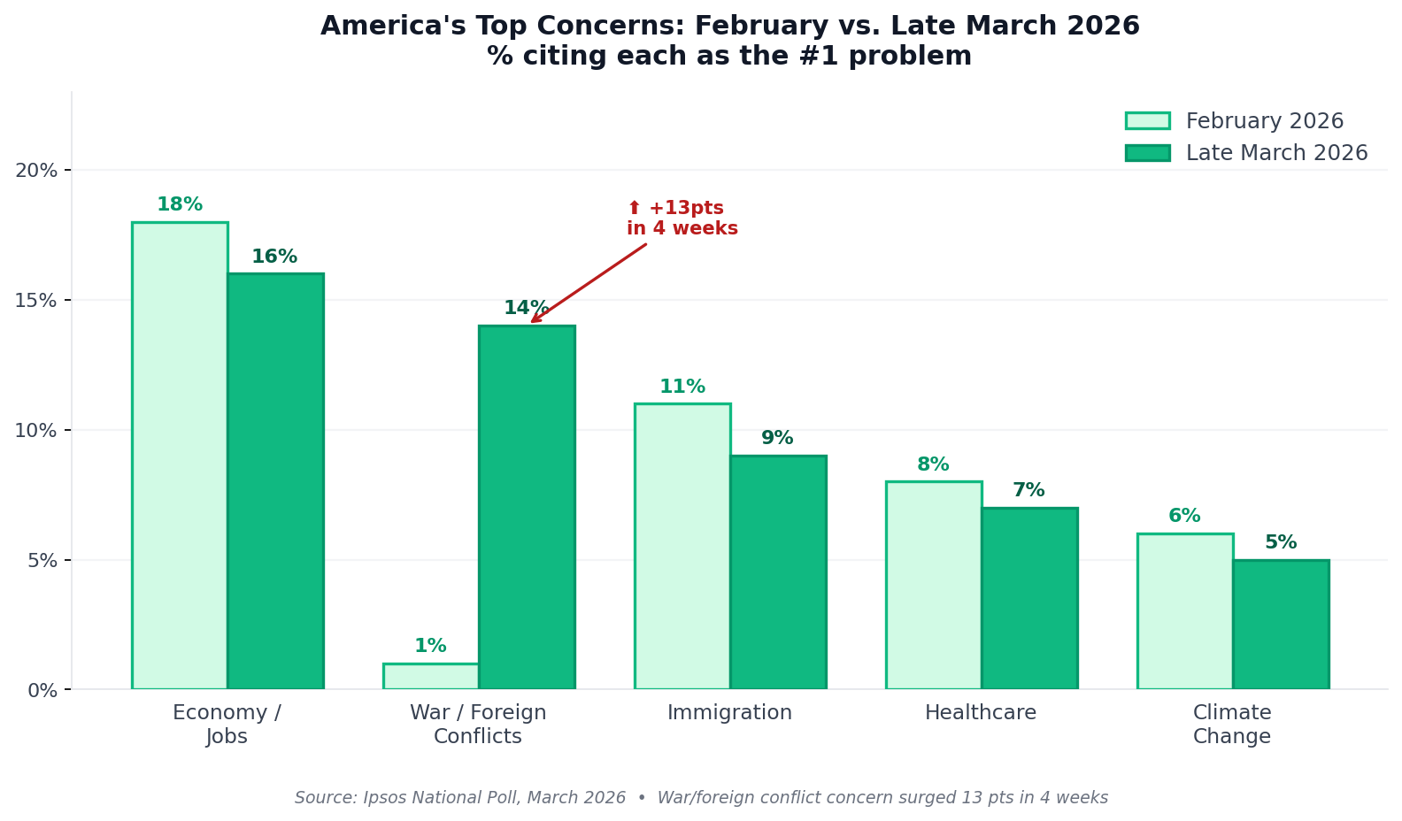 14% — Americans citing war/foreign conflicts as #1 problem (up from 1% in February)