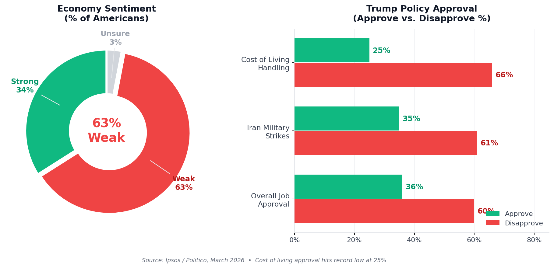 Midterm fears are rising inside Republican circles as Trump's numbers slide across every economic metric the public feels weekly. Cost-of-living approval at 25% is a political emergency — 3 out of 4 Americans think the president is failing on the issue they feel at the pump and the grocery store.